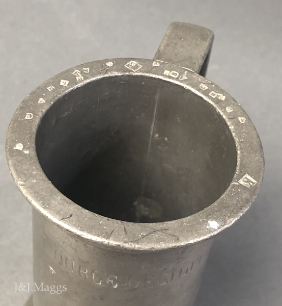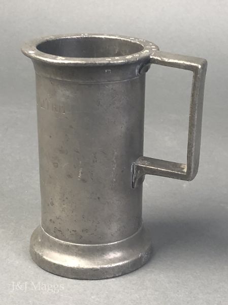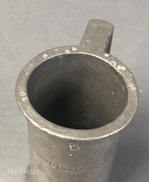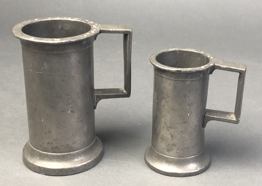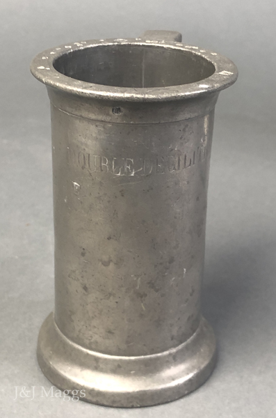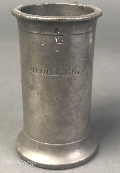 One is labeled “DOUBLE DECILITRE”, the other “DECILITRE”, and both are extensively touchmarked, including around the rims. An unusual form, with tall, narrow cylinders and rectangular handles.
