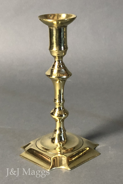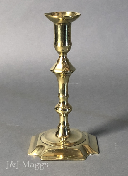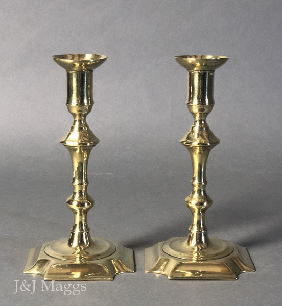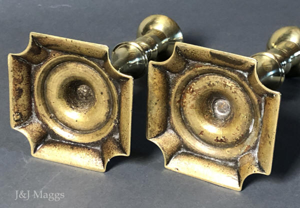 An exceptional pair of candle holders, with square knops in their braised stems. They appear identical to a pair in Eloy Koldeweij’s The English Candlestick, 1425 – 1925, CAT. 85. In excellent condition with no repairs or restoration.