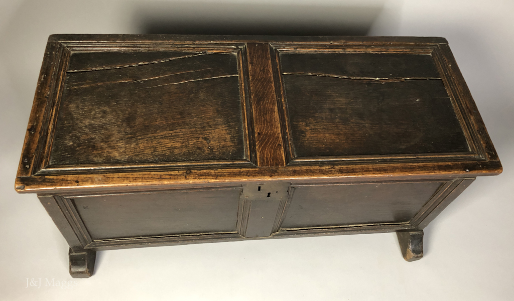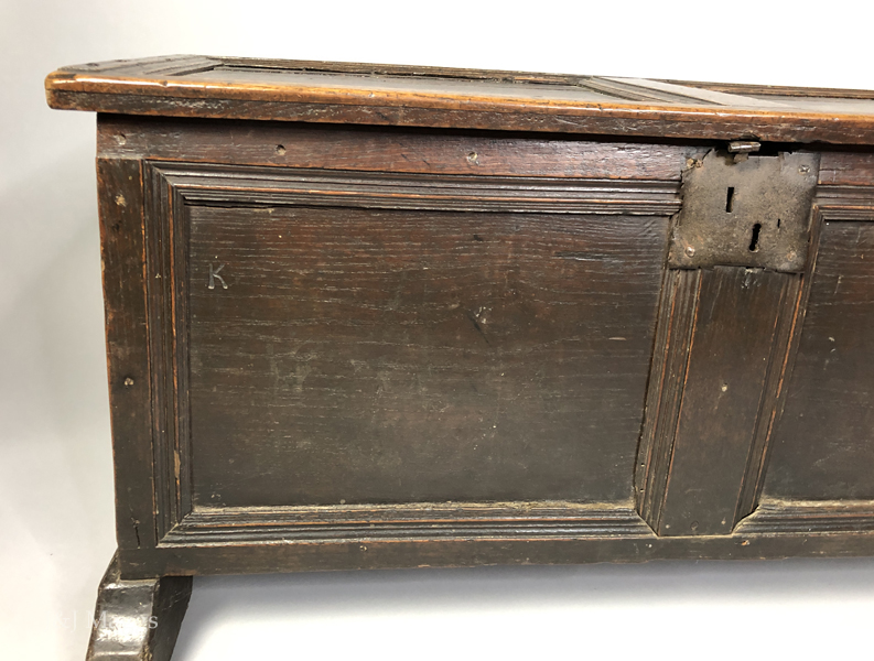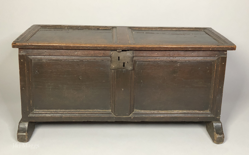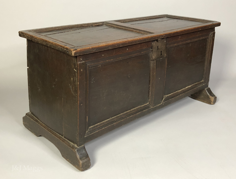 Mouldings, attached with pegs, cover the face and the top, creating a two-panel effect on each. There are strap hinges under the lid. Tenons at the bottom of the sides of the chest extend into mortises in the substantial shoe feet, into which they are secured with pegs.