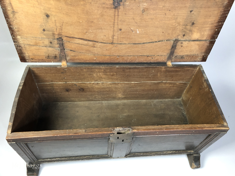 A very interesting oak chest, perhaps transitional, dating from the late 1500’s to early 1600s. Created as a boarded chest, it is joined with rose-head nails, many invisible as detailed mouldings were applied to cover the joinery and dress up the piece. These heavy mouldings are the only decoration here, other than the lock plate and hasp (now lost).