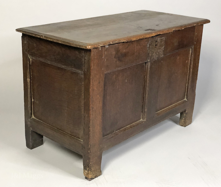Built with a heavy, joined frame on each of its four sides, this coffer appears to date from the earliest years of the 17th century. Faced with the need to decide which surface of the elements of the frame deserved the finest finish, it is not uncommon to see the edges of the rails and stiles of the front and sides of a coffer treated with a moulding plane. Such is the case here, and the insides of these surfaces are finished without embellishment. The joiner who made this coffer, however, decided to apply the decorative moulding to the inside of the back, since it is the surface we see upon lifting the lid.