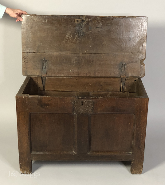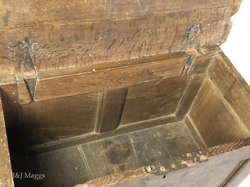 This attention to detail and the sturdy construction of the coffer itself suggest that the lid, two oak boards doweled or splined together with only a tiny bead around its perimeter, may be a later replacement. The replaced hinges offer additional support for this conclusion.