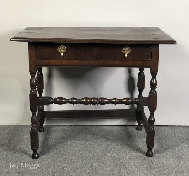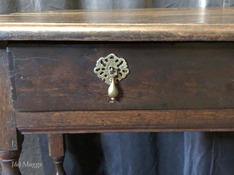 The turnings in the four legs are all identical with two blocks in each to accommodate both stretcher locations. Above the single drawer is an expansive three-board top. It is interesting to note that the first and second board are trapezoids, not rectangles. We surmise that the source of all three boards was a single, irregular block of wood, from which the three boards were cut. The first was placed with its square end forward, and the second board was flipped to match the angle of the first. The third was narrow enough to be made by squaring a third “slice”.
