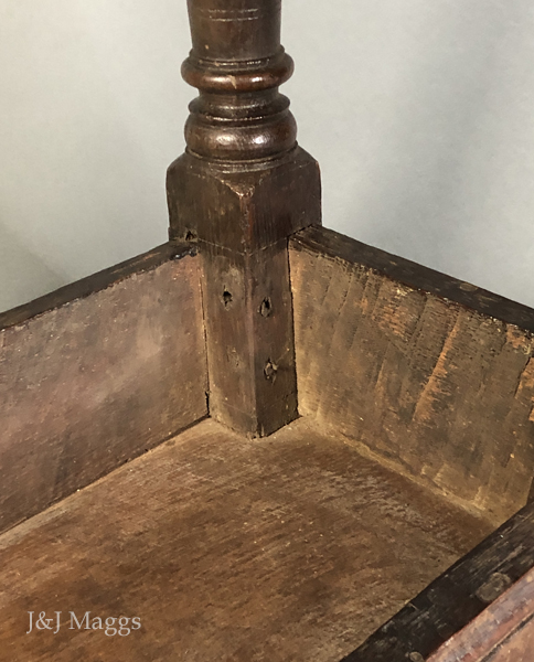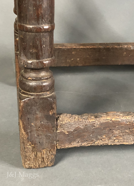 The single board top with thumbnail moulded edge is pegged to a base of four column-turned legs joined by plain stretcher rails and a simply moulded apron. The stool has a dry surface, and all joints are tight and secure. The top of one stretcher is worn.