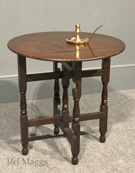 A wonderful centennial of the 18th-century collapsing tables that provided portable seating at outdoor events, consisting of two “gates” that pivot around a central demi-post, and a round top. The four legs and the center post are turned with the same patterns, while the four rails are plain. The three-board top is hinged to collapse for easy carrying or leaning when the gates are turned together.