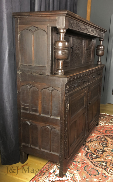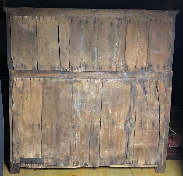The sides of both sections are simply framed: a single panel above, and two smaller, horizontal panels below. This curiosity must be noted: The left-hand side of the piece is decorated with applied Gothic style mouldings, while the right-hand side is undecorated. The Gothic arches suggest that the cupboard may have been made for a church, and its undecorated side suggests that it may have been intended for a corner of the sacristy. The back is covered with rough-sawn oak boards, and their surface and condition confirm the integrity of the cupboard.