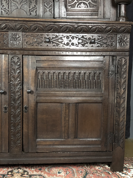 The upper section is framed by a carved frieze, two large, highly ovaled turned posts, and a shallow shelf. Within this frame are a pair of joined doors each holding a rectangular panel, decorated with four demilunes containing foliage around a central rosette. Behind the doors is a spacious cupboard, divided invisibly at its center by a thin board. The central panel is carved with another foliate design and is flanked by two carved stiles. The cumulative effect of the carving is lavish and visually appealing.