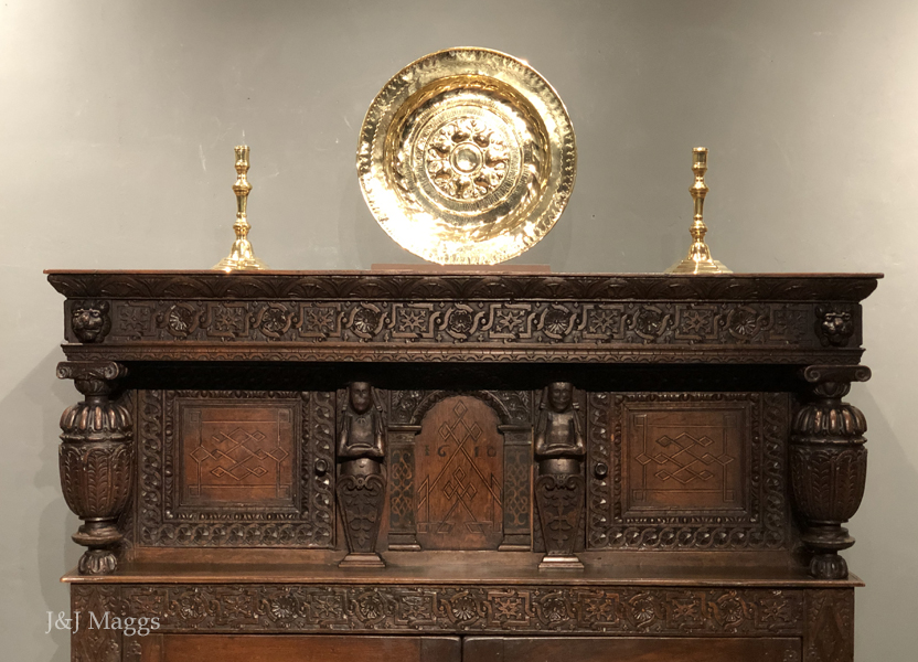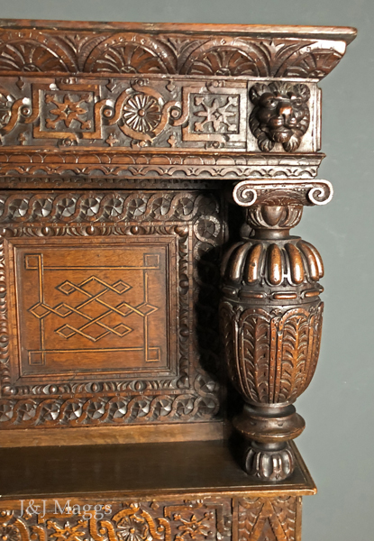 Without doubt, the most lavishly decorated court cupboard we’ve ever owned, and the quality of the carving is exceptional. The piece is in two sections, each crowned by a frieze in which alternating circles and rectangles frame three floral figures: the Tudor rose, a multi-petalled flower, perhaps a daisy; and a third, more abstract than the other two. The upper and lower friezes are identical but for the pair of lions that frame the upper.