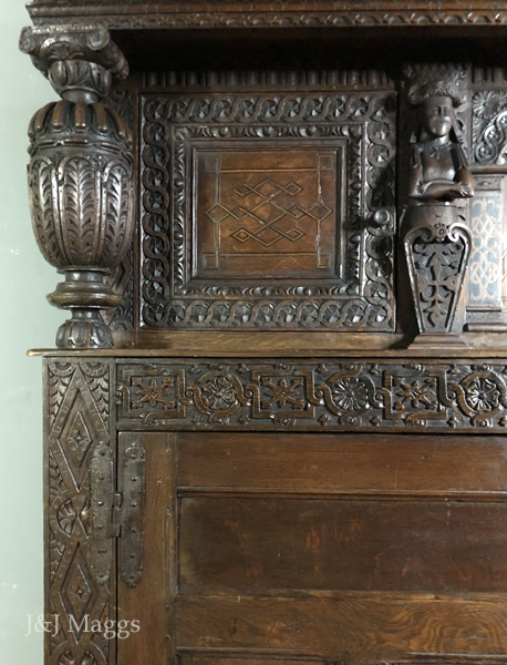 Compared to this festival of carving and inlay, the lower section is rather bland, although its side stiles are carved with the pattern of their counterparts on the upper section, and the quite plain three-panel doors are attached with foliated H hinges with crowned hearts – top of the line and original to the piece.