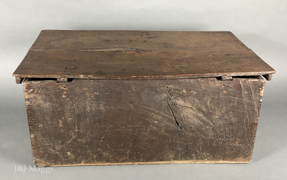 A deep box with shallow carving on its upper half and chip carving at the ends of its face. Perhaps its most remarkable feature is its back, which has bowed to such a degree that the hinges were pried from it. Fortunately, these original strap hinges were still present, although dysfunctional, and have been re-attached and are now functioning. The hasp and the working lock are also present. The outer cleats have been replaced, and two additional cleats have been added for stabilization.