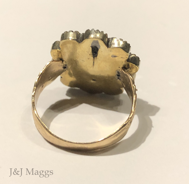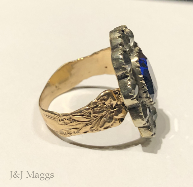 A lovely ring in 15k gold, which has a central oval faceted sapphire paste stone (9x11mm), and a 10-stone (4mm) diamond paste halo. All stones have been closed-back crimp-set in silver for magnification. The decorative gold shank joins the central mounting at the shoulders with ribbon and floral designs, and an undulating shank continues to the other shoulder. This 15k gold ring is English, late Georgian. This ring is a size 8 and it glows….