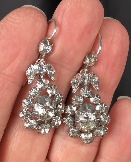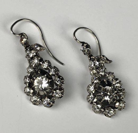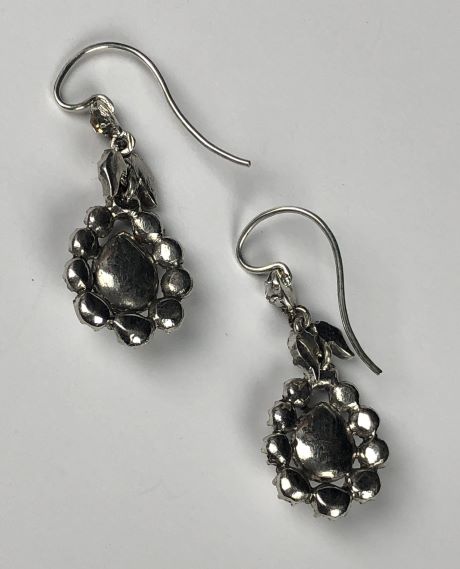 A stunning pair of tri-part clear diamond paste pendant earrings in silver. The top is a single diamond paste stone closed back set and attached to the graceful silver shepherd’s crook earwires. The central 3-stone section is a stylized silver flower and leaves, closed-back set with foiled and faceted diamond pastes. Suspended from this is a teardrop-shaped pendant closed-back, silver set with 10 stones surrounding a central larger stone, just beautiful. Overall measurements are 1 ½” and ⅝” at the widest point. Earwires go into the front of the ear. English, ca. 1830. Sensational sparkle.