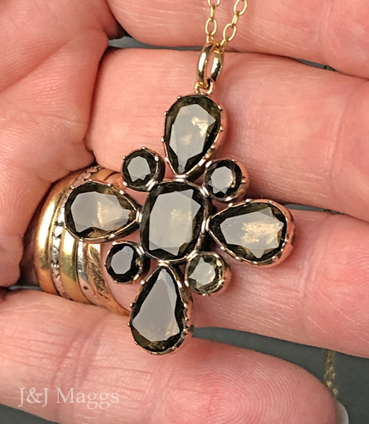 This gorgeous Georgian gold pendant has the form of a four-pointed floral/starburst design, closed-back set with 9 topaz stones in round, rectangular and teardrop shapes. The measurements of this beautiful pendant are 1 ¼” across, and 1 ½” from the top of the bail to the bottom of the pendant. These topaz stones are perfectly lovely. There is an old repair at the back of one teardrop topaz. This English or Iberian pendant has been suspended from a later gold-filled chain (18”), however it may easily be worn on a silk cord or ribbon.