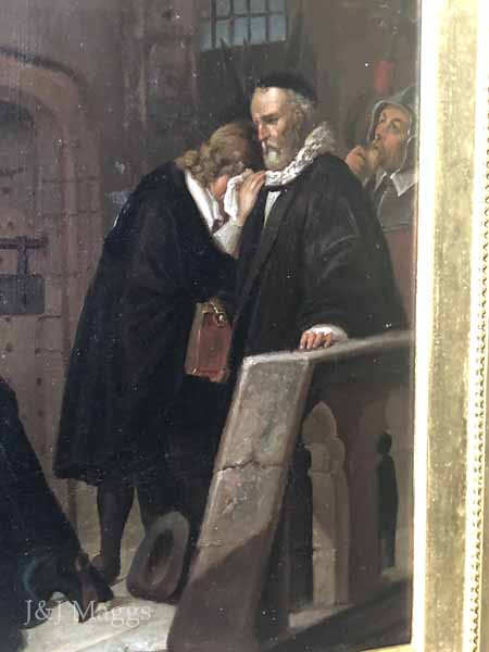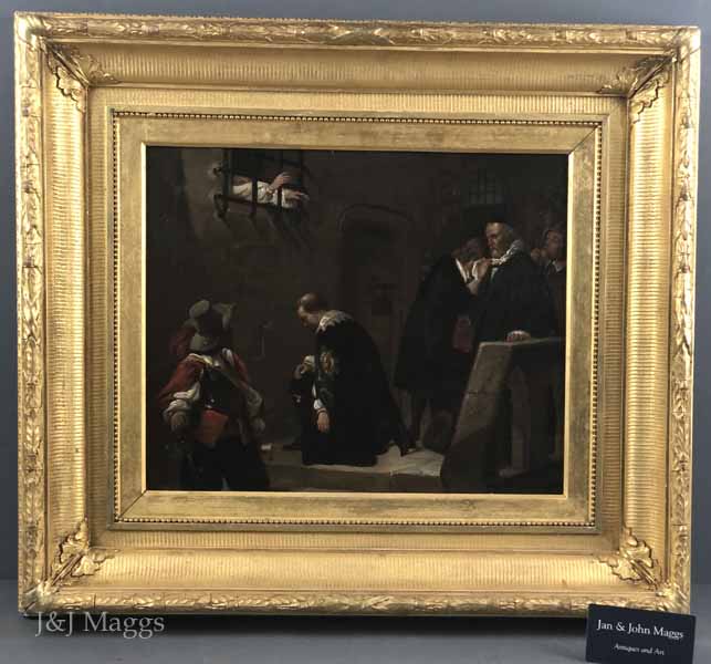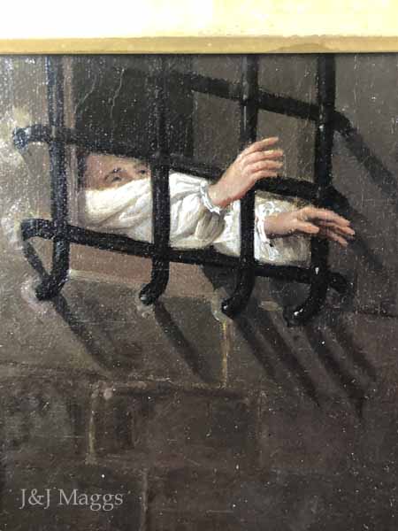 This painting, a copy of one by Paul Delaroche (1797 – 1856), may depict Henry’s agents delivering the verdict. The Duke is invisible to us but for his outstretched arms, and a man is seen wiping tears from his eyes. Only two members of the party are looking at the Duke: the man in red with sword in hand, has turned his head to look at the barred window, while on the far right, another, a sheriff perhaps, gazes vacantly at the window while eating a slice of bread. The central figure kneels, affirming the respect afforded the Duke by his subjects. The artist has captured the drama of this important moment.