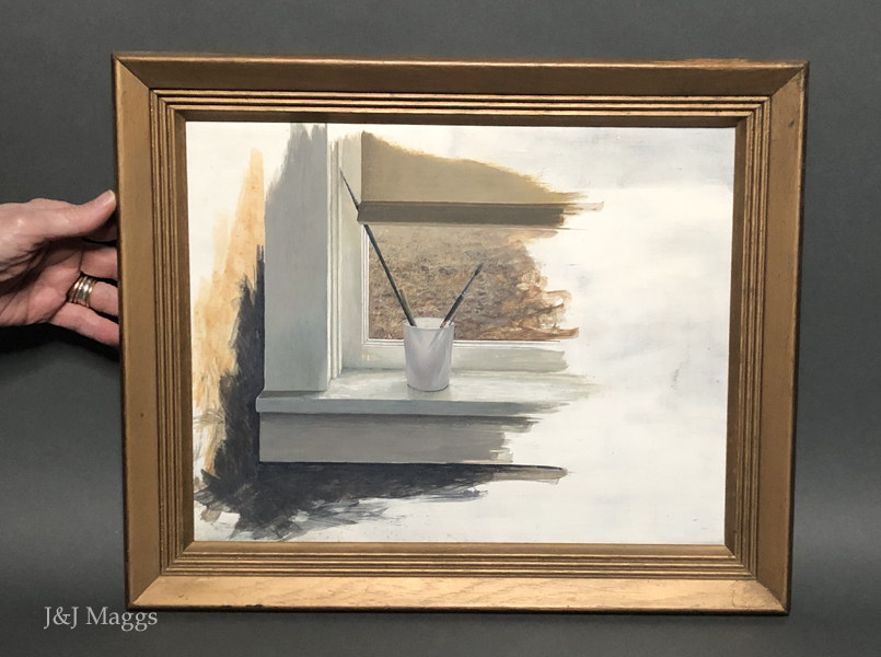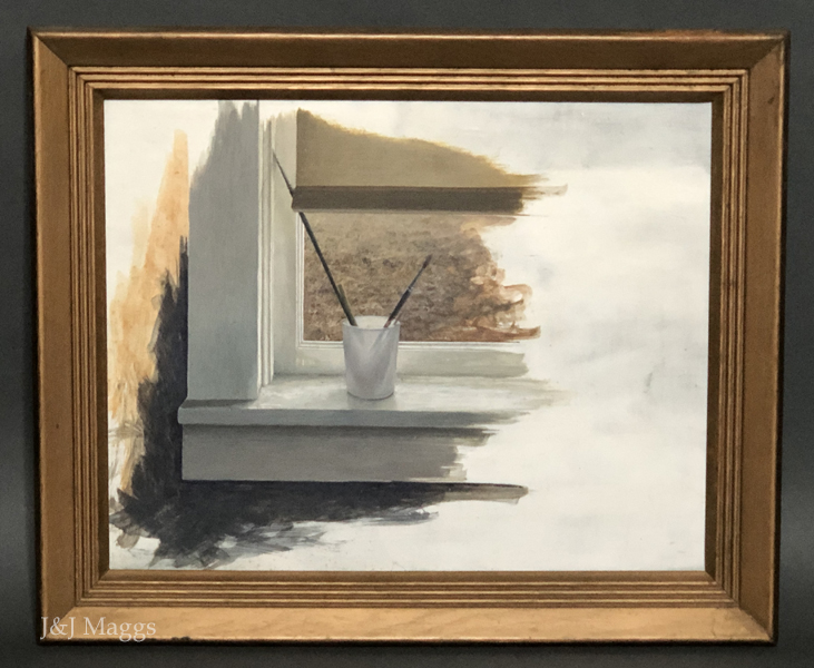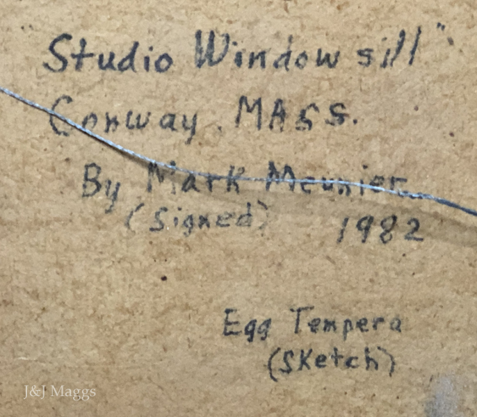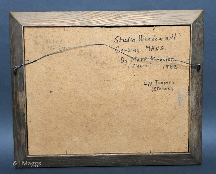 Born in Western Massachusetts and a longtime resident of Conway, Mark Meunier began painting in egg tempera in the late 1970’s. He was represented by several galleries in the Northeast. We purchased this fascinating study juxtaposing interior and exterior content from a local estate.