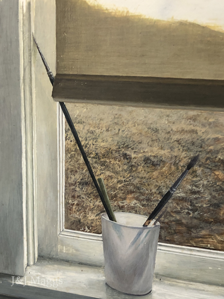 The artist’s brushes in a cup are framed by the windowsill and the shade above it. Outside, the grass has changed color with the season.