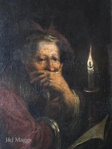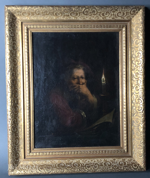 A man looks up pensively from the paper from which he is reading by candlelight and stares at the viewer in this oil painting. The style strongly suggests the work of Rembrandt or a follower. The painting has been relined and mounted on 19th century stretchers.
