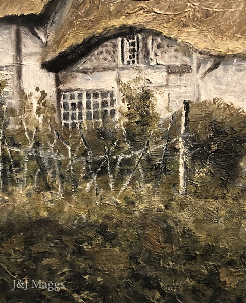 A grand, early farmhouse with three chimneys and an inviting enclosed garden. No one is about, and the dialog is between subject and painter. An engaging painting, with interesting textured brushwork.