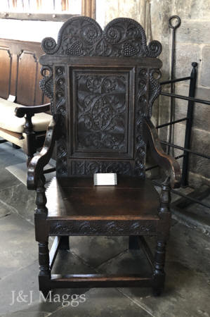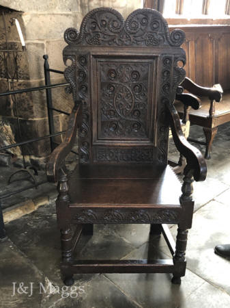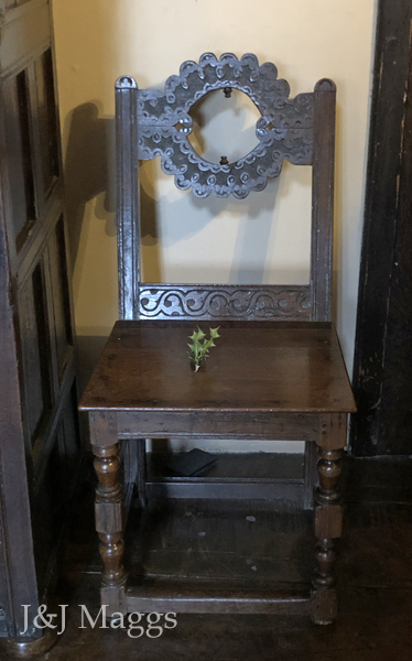 The two panel-back wainscot chairs, each dated 1689, probably commemorate a marriage in that year, although the Trust doesn't appear to know more than that.