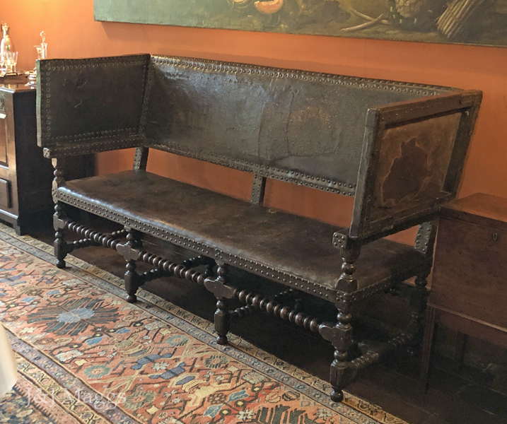 In the dining room, this leather-upholstered settee dates from approximately 1660.