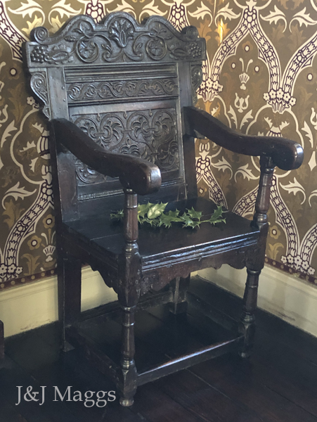 An oak wainscot chair, probably supplied by the 19th-century London dealer/furniture maker Samuel Pratt, who is credited with much of the furniture in the house