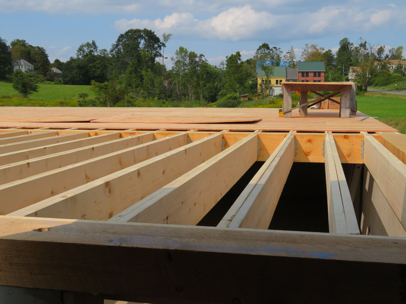 The sills and floor beams are complete; many of the floor joists are installed.