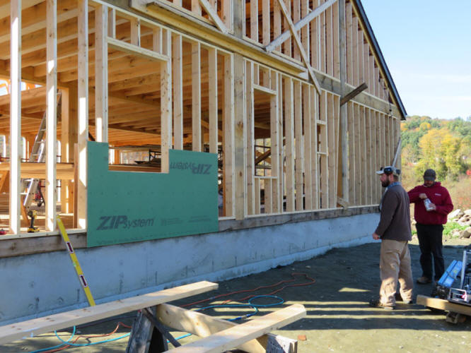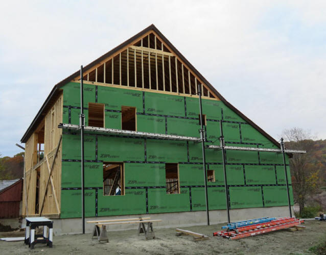 Jesse Brown, who cut and raised the frame, inspects the first installed piece of exterior sheathing.