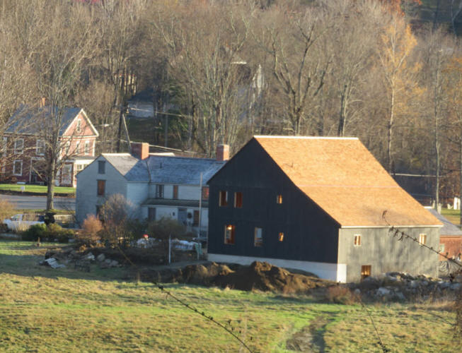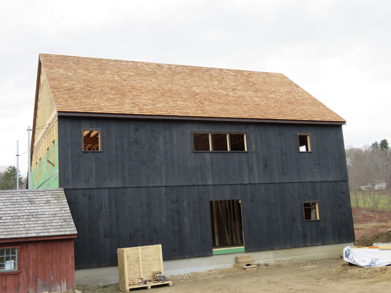 The facade, with its siding finished, ready for doors and windows