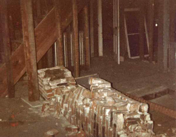 Twin chimneys, which had been built in the 19th century, when the original center chimney was replaced with a black walnut central stairway, were lying on the floor, where they had crashed during a failed attempt to remove them brick by brick.